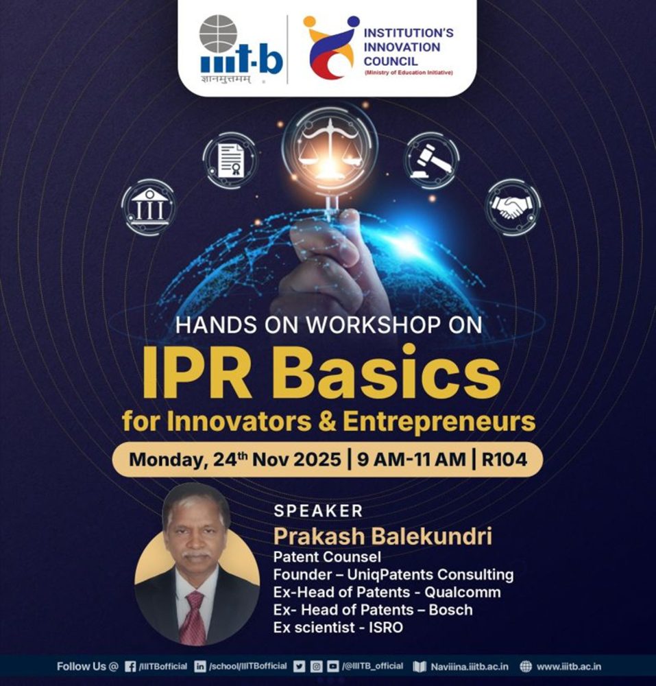 November 24, 2025: “Hands-on Workshop on IPR Basics for Innovators & Entrepreneurs” by Mr. Prakash Balekundri, Patent Counsel & Founder & CEO, Unique Patent Consulting.
