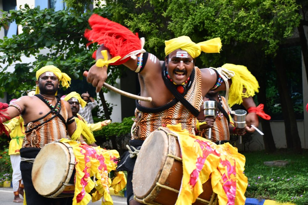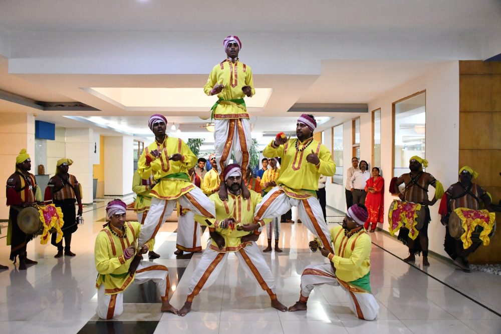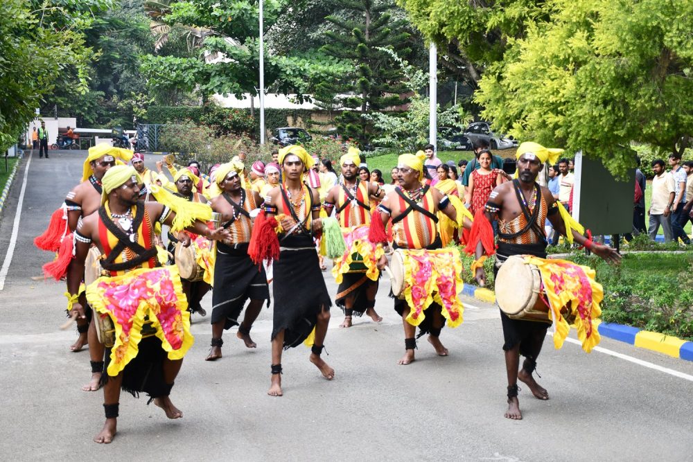 The celebration began with a powerful and captivating performance of Dollu Kunitha and Kamsale, followed by acts that highlighted the richness of local arts. The institute’s music club, Symphony, added to the festive atmosphere with a melodious performance that resonated beautifully with the occasion. The campus, adorned in shades of red and yellow, reflected the unity and pride associated with the celebrations.