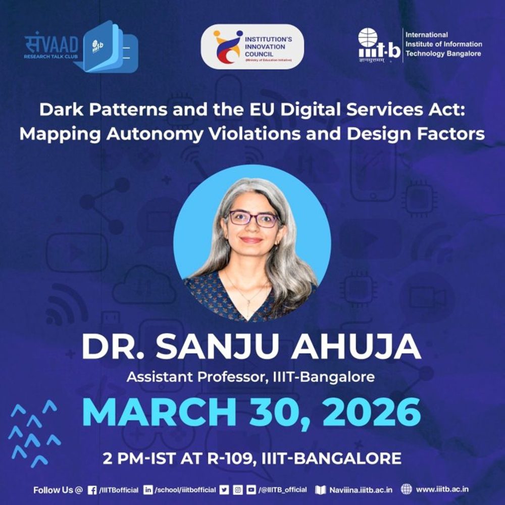 March 30, 2026: “Dark Patterns and the EU Digital Services Act: Mapping Autonomy Violations and Design Factors” by Dr. Sanju Ahuja, Assistant Professor, IIIT-Bangalore