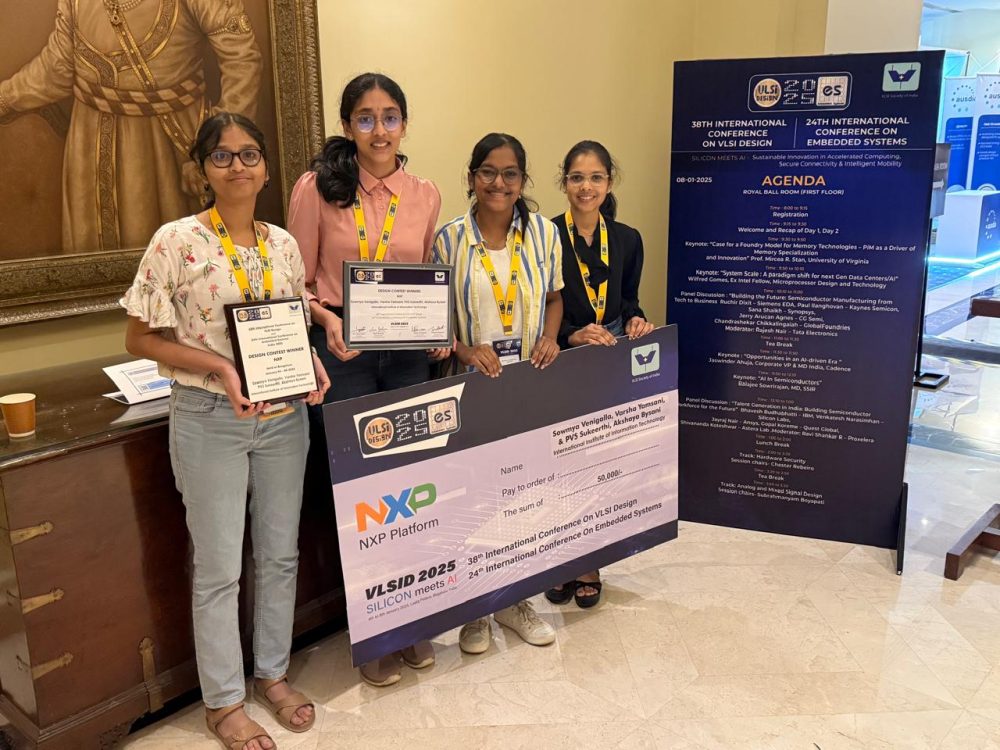 We are delighted to share that our i-M.Tech. students—Sowmya Yenigalla, Varsha Yamsani, Akshaya Bysani, and Sukeerthi PVS—have won the Best Design Contest Award in the NXP board category at the 38th International Conference on VLSI Design & 24th International Conference on Embedded Systems, held recently in Bangalore.