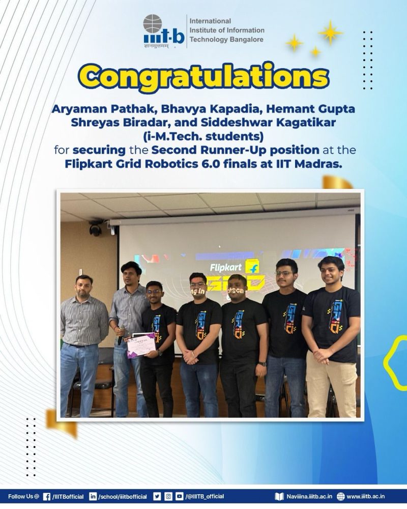 With innovation at its core, the i-MTech students’ team—Aryaman Pathak, Bhavya Kapadia, Hemant Gupta, Shreyas Biradar, and Siddeshwar Kagatikar—secured the Second Runner-Up position at the Flipkart Grid Robotics 6.0 finals, held at IIT Madras. Competing against 3,400+ teams, they developed a groundbreaking automation-driven solution incorporating brand detection for product identification, MRP and expiry detection using OCR and ML models, and freshness detection for quality assurance. Their work aims to revolutionize retail operations by minimizing manual intervention and enhancing efficiency. This remarkable achievement reflects IIIT-B’s commitment to fostering technological innovation and problem-solving excellence. Kudos to the team.