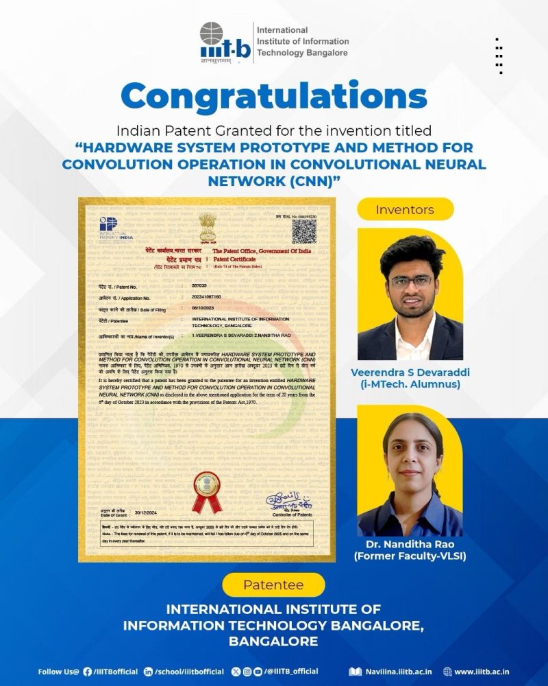 IIIT-Bangalore is proud to announce the grant of an Indian Patent for the invention “Hardware System Prototype and Method for Convolution Operation in Convolutional Neural Network (CNN).” Developed by Veerendra S Devaraddi (i-MTech. alumnus) and Dr. Nanditha Rao (former Faculty – VLSI), this innovation enhances the efficiency of convolution operations in deep learning applications.