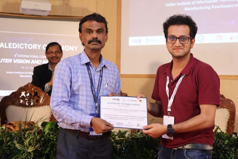Research Associate Anirban Mukherjee brought laurels to IIIT Bangalore by winning the IAPR Best Student Paper Award at the International Conference on Computer Vision and Image Processing (CVIP) 2024, hosted by IIITDM Kancheepuram.