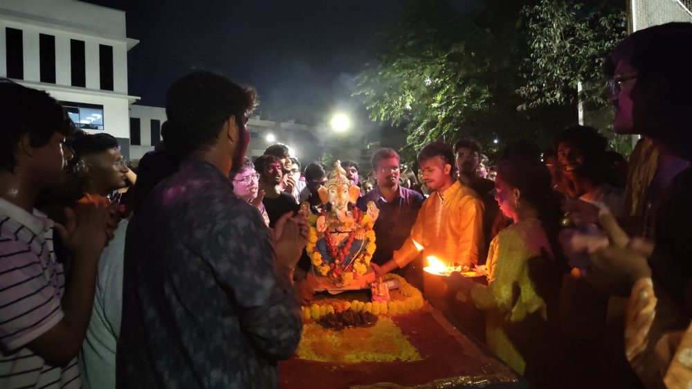 After two days of heartfelt prayers to Lord Ganesha, the time had come to bid him a farewell. It began with the uttarpooja with poojari’s blessings, followed by aarti. Lord Ganesha was then taken in a grand procession around the college. Along the way, students danced to rhythmic beats of drums, joyfully throwing colours on one another. They danced with joy and enthusiasm by chanting “Ganapathi Bappa Morya!”. Ganesha was then immersed in a sacred kund with devotion, gratitude and hope for his return next year.