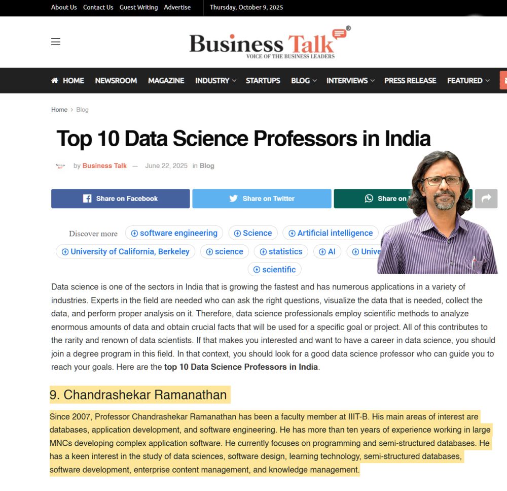 We are delighted to share that Prof. Chandrashekar Ramanathan, Dean (Academics), IIIT-Bangalore, has been recognized among the Top 10 Data Science Professors in India by Business Talk Magazine.